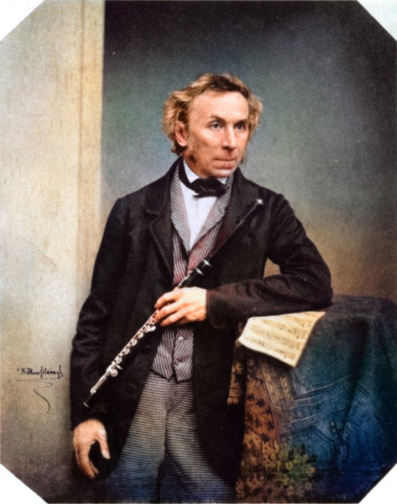 Γιος ενός χρυσοχόου, ο Böhm σπούδασε φλάουτο και έγινε μουσικός της αυλής του Μονάχου το 1818. Το 1828 άνοιξε ένα εργοστάσιο στο οποίο το 1832 ανέπτυξε το πρώτο λεγόμενο φλάουτο Boehm, που χαρακτηρίζεται από ένα σύστημα μοχλών (πλήκτρα) και δαχτυλιδιών, ελέγχοντας το άνοιγμα και το κλείσιμο των οπών τόνου. Τα δακτυλιοειδή πλήκτρα όπου επιτρέπουν σε ένα δάχτυλο να κλείσει μια τρύπα και ταυτόχρονα, μέσω ενός άξονα που συνδέεται με το δαχτυλίδι, να ενεργοποιήσει ένα άλλο κλειδί μακριά από το δάχτυλο. Με τη χρήση πλήκτρων μπορείτε να τοποθετήσετε τις τρύπες όπου απαιτούνται ακουστικά και να τις κάνετε όσο μεγάλες χρειάζεται για τον σωστό τονισμό, χωρίς να λαμβάνεται υπόψη το μέγεθος του χεριού.